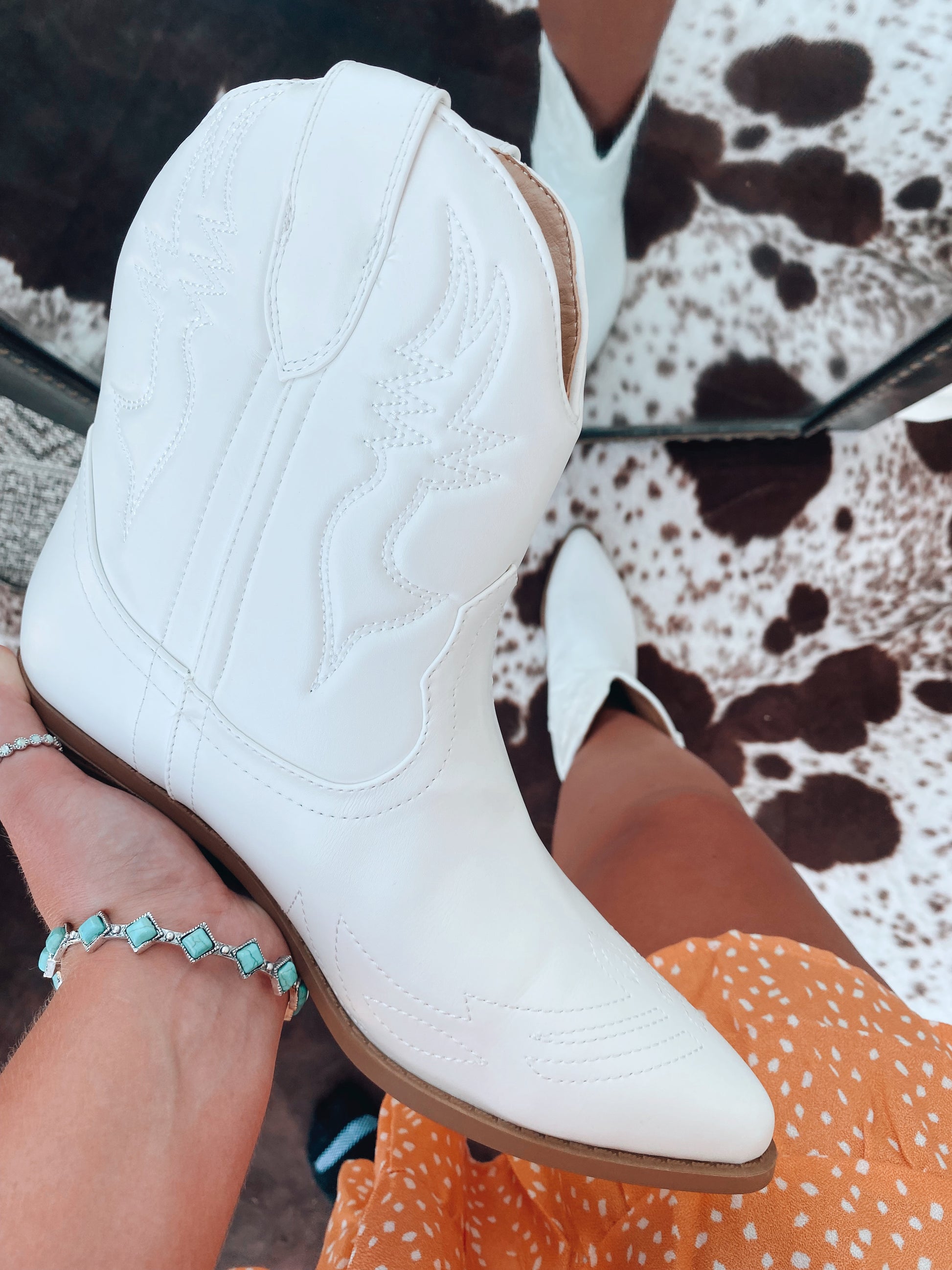 The Amber Boots are the cutest white booties with some western flare. Pair this with your favorite dress for the cutest look!