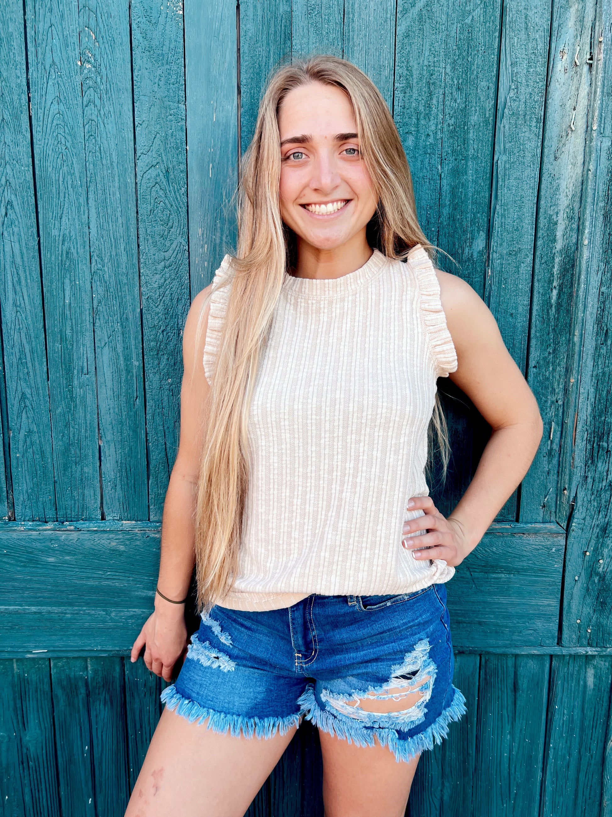 The Briley Ruffle Tank is the cutest cream colored, ribbed tank with ruffled accents on the sleeves. Pair this with shorts or jeans for the perfect look!