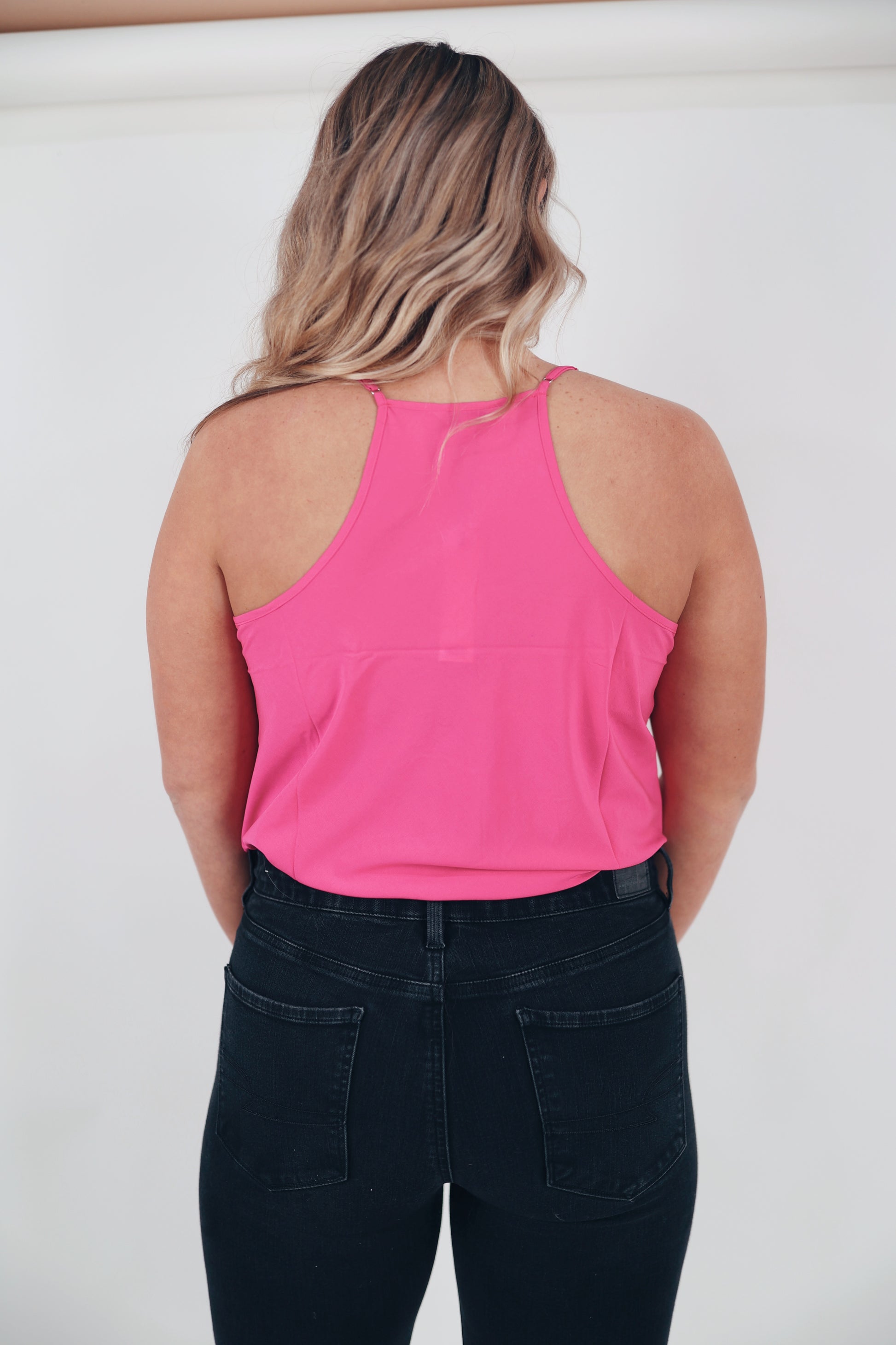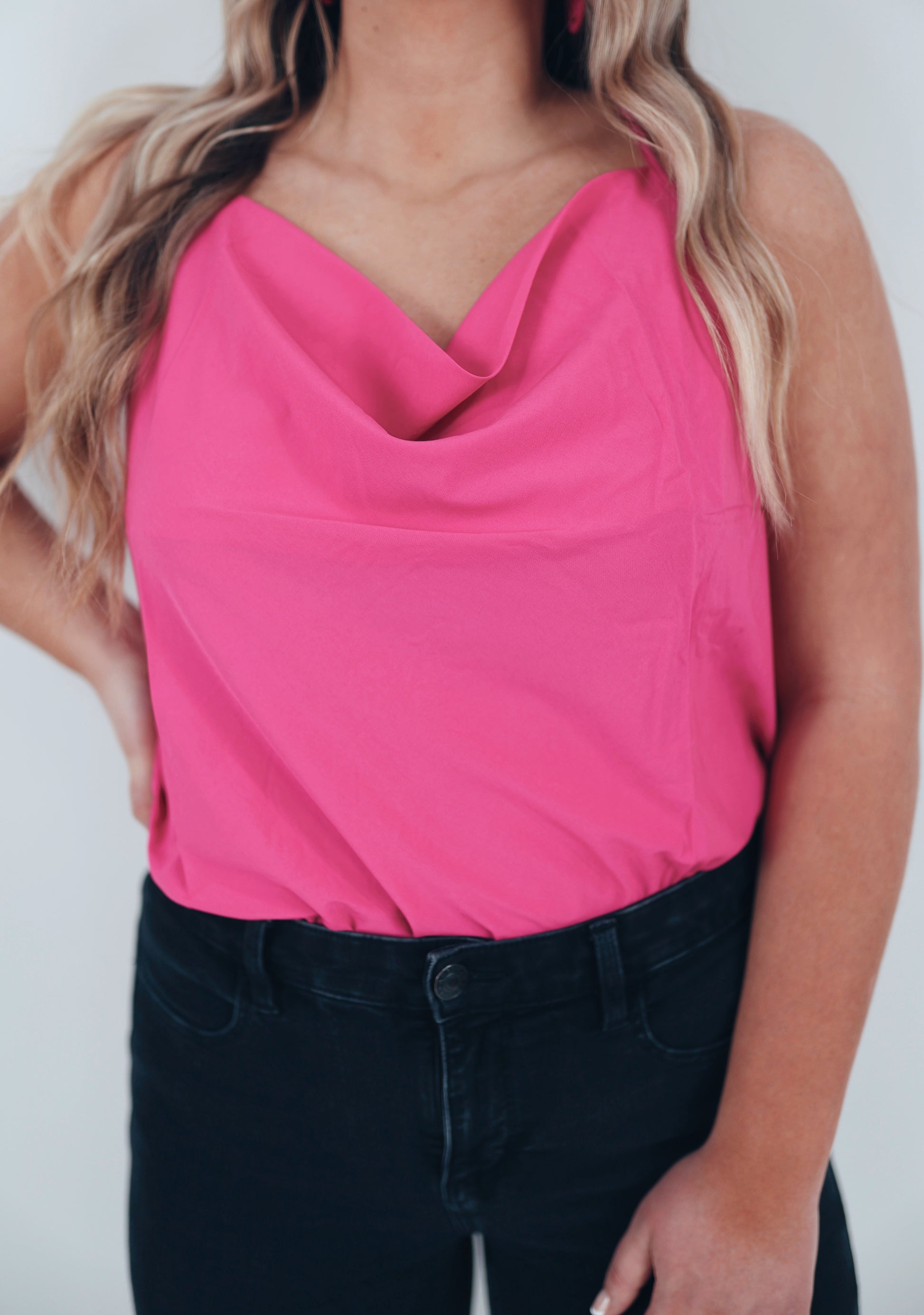 The Cami Cowl Neck Tank is made of durable hot pink fabric, providing a unique and stylish look. Its cowl neck design gives a classic and flattering silhouette. Perfect for your summer wardrobe.