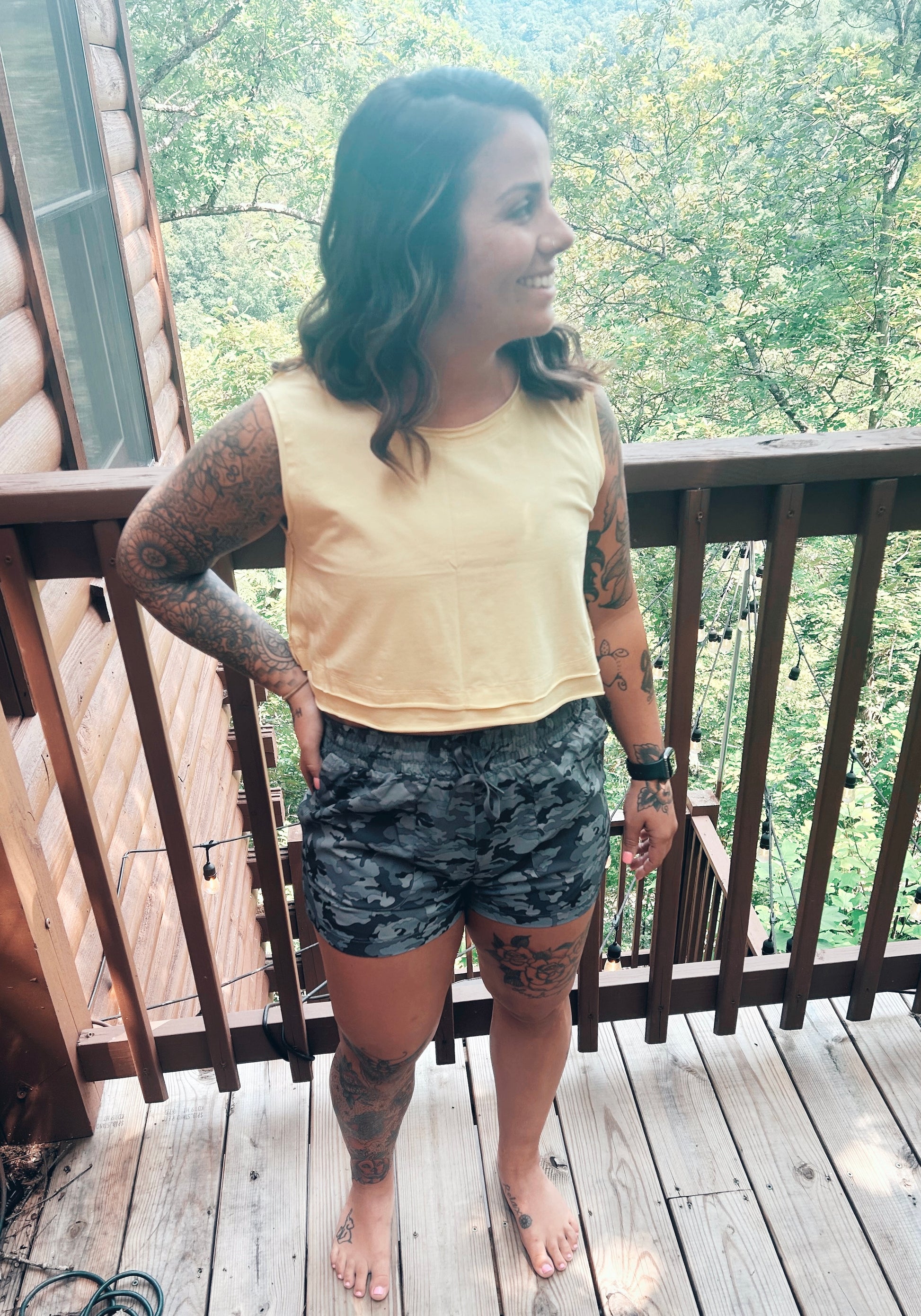 The Friday Hues Tank is aΒ beautiful sunset yellow cropped tank stands out with its vibrant color and flattering cut. The perfect addition to any wardrobe, this tank is the perfect blend of style and comfort. Make a statement during your next workout!