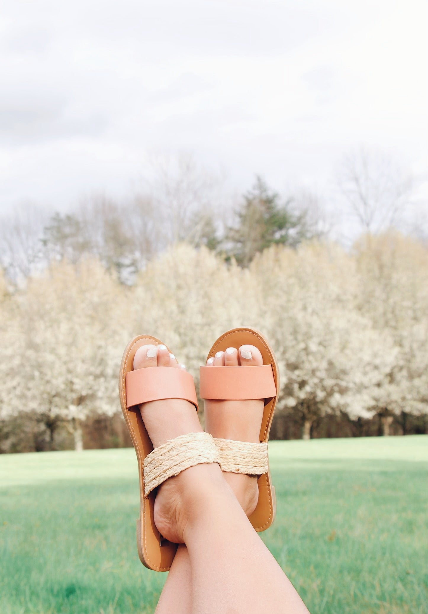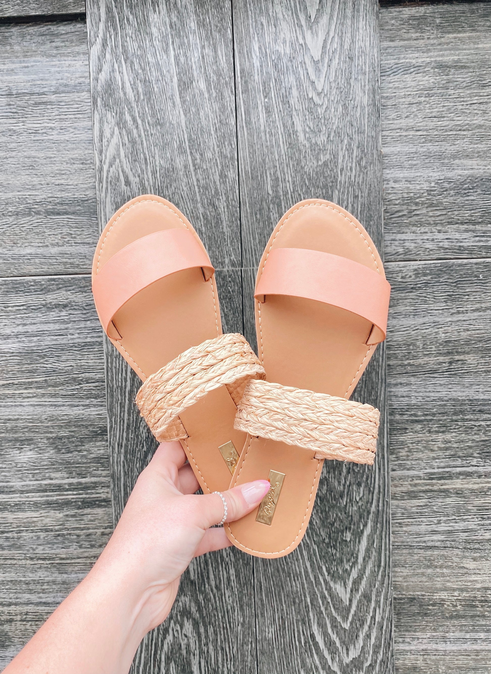The Kiera Double Strap Coral Sandals are the comfiest lightweight sandals. These come in a tan and coral color made from leather and straw fabric with a .5" heel height.