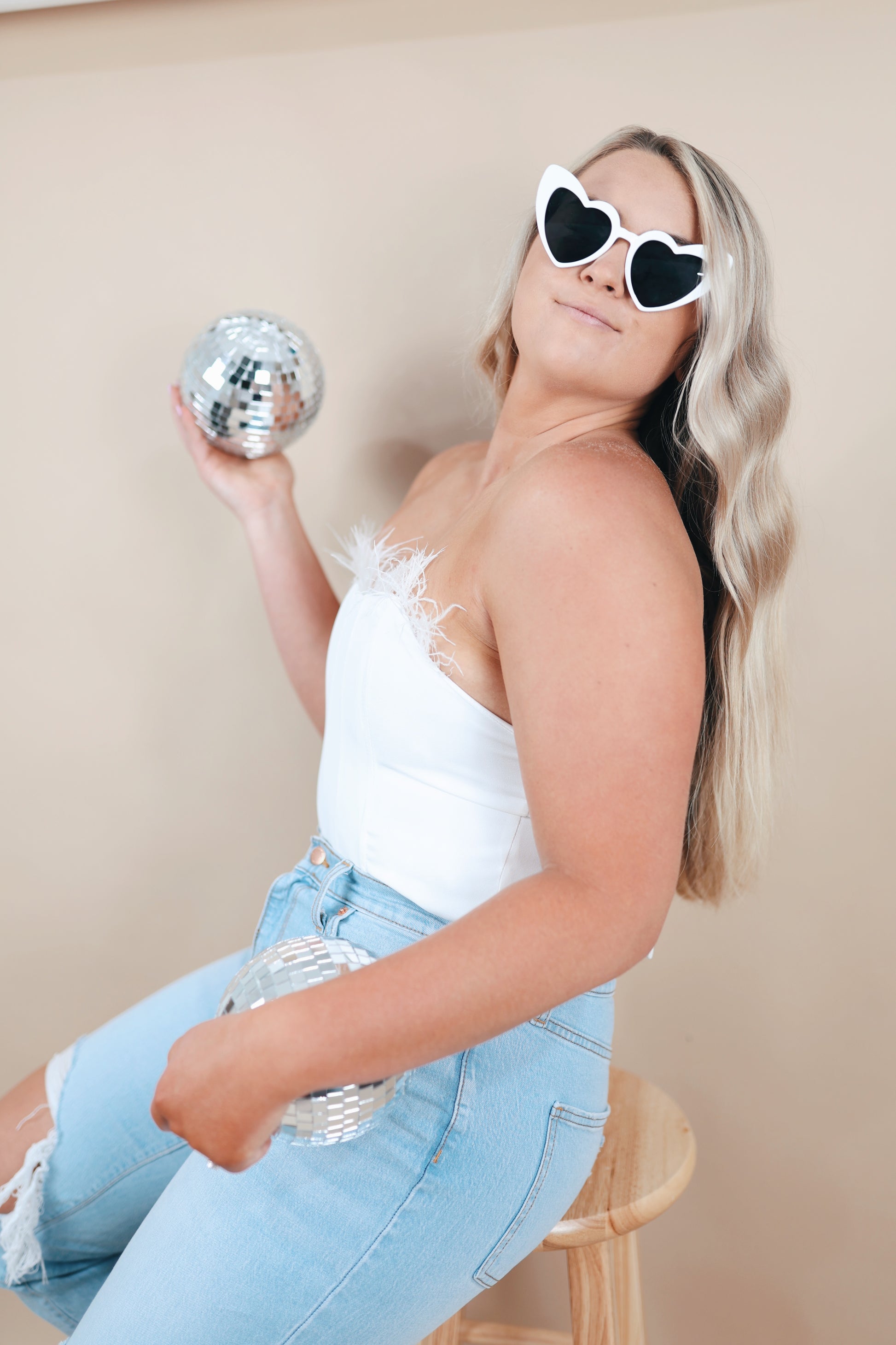 Adorn yourself in elegant style with The Mary Feather Top. Featuring a classic white corset and delicate feather detail, you'll be sure to make a statement. Feel confident and beautiful with a light yet luxurious look.