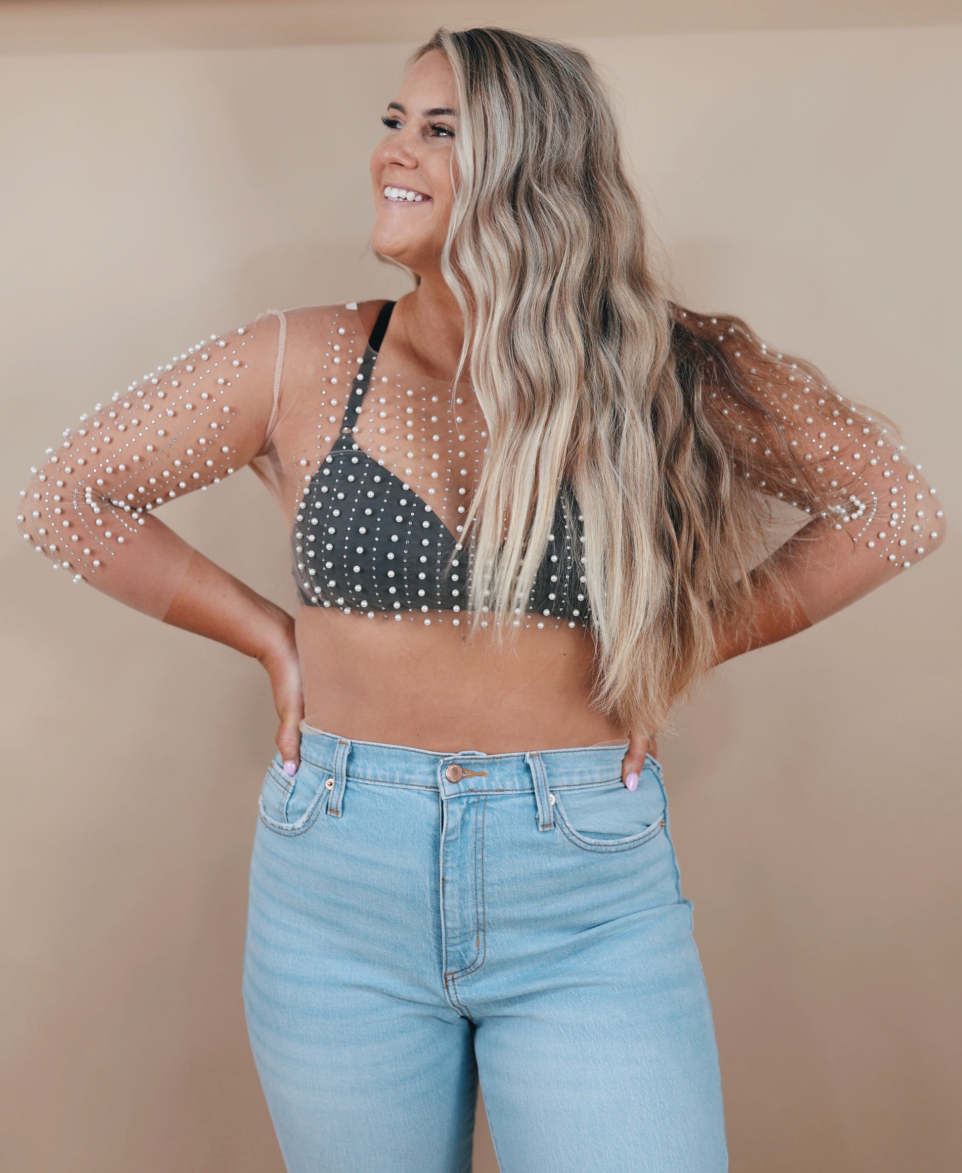 Turn heads in the Pearl Polley Top! Crafted from mesh and adorned with pearls and rhinestones, this sophisticated top is sure to be the envy of all your friends. Dare to dazzle with stylish elegance!