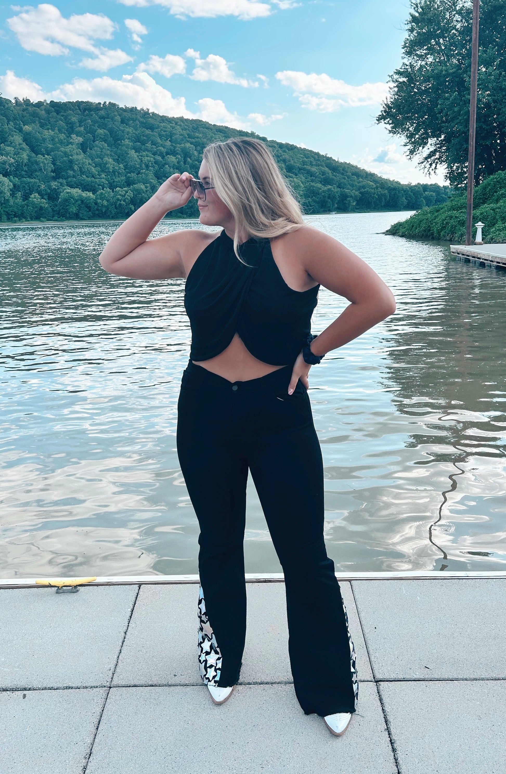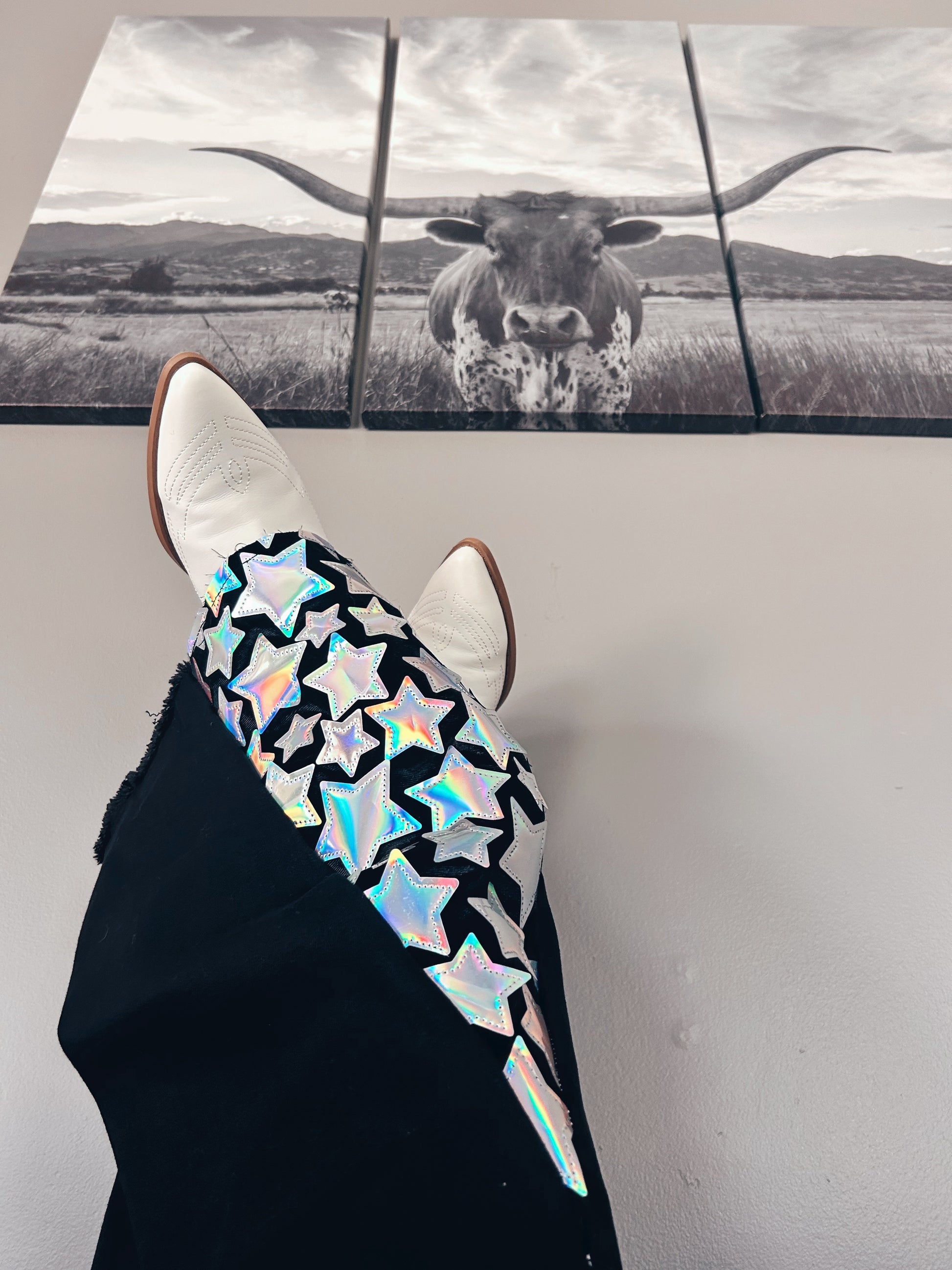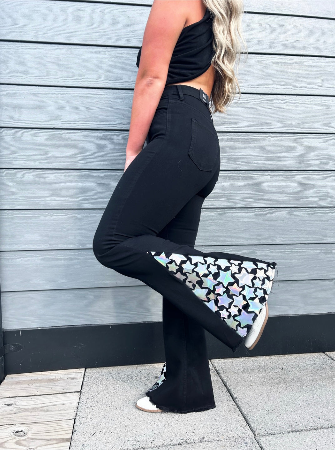 Achieve that glamorous style with The Shining Star Flares. Feel confident and dazzling in these black bell bottom jeans with their hologram stars bottoms and a frayed hem. Perfect for your next Nashville trip or country concert!