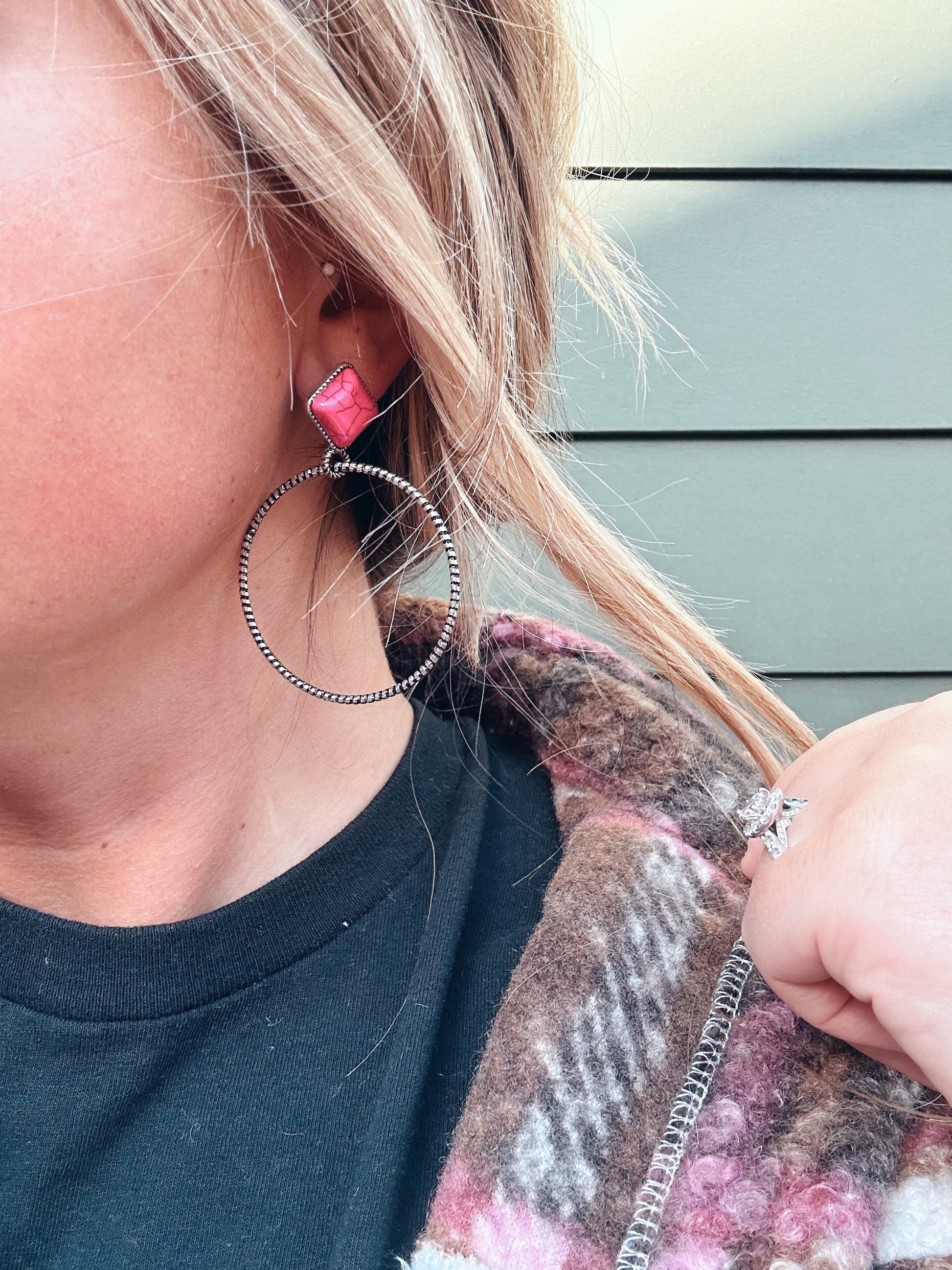 The cutest silver hoops with a pink marble accent perfect to dress up any outfit!