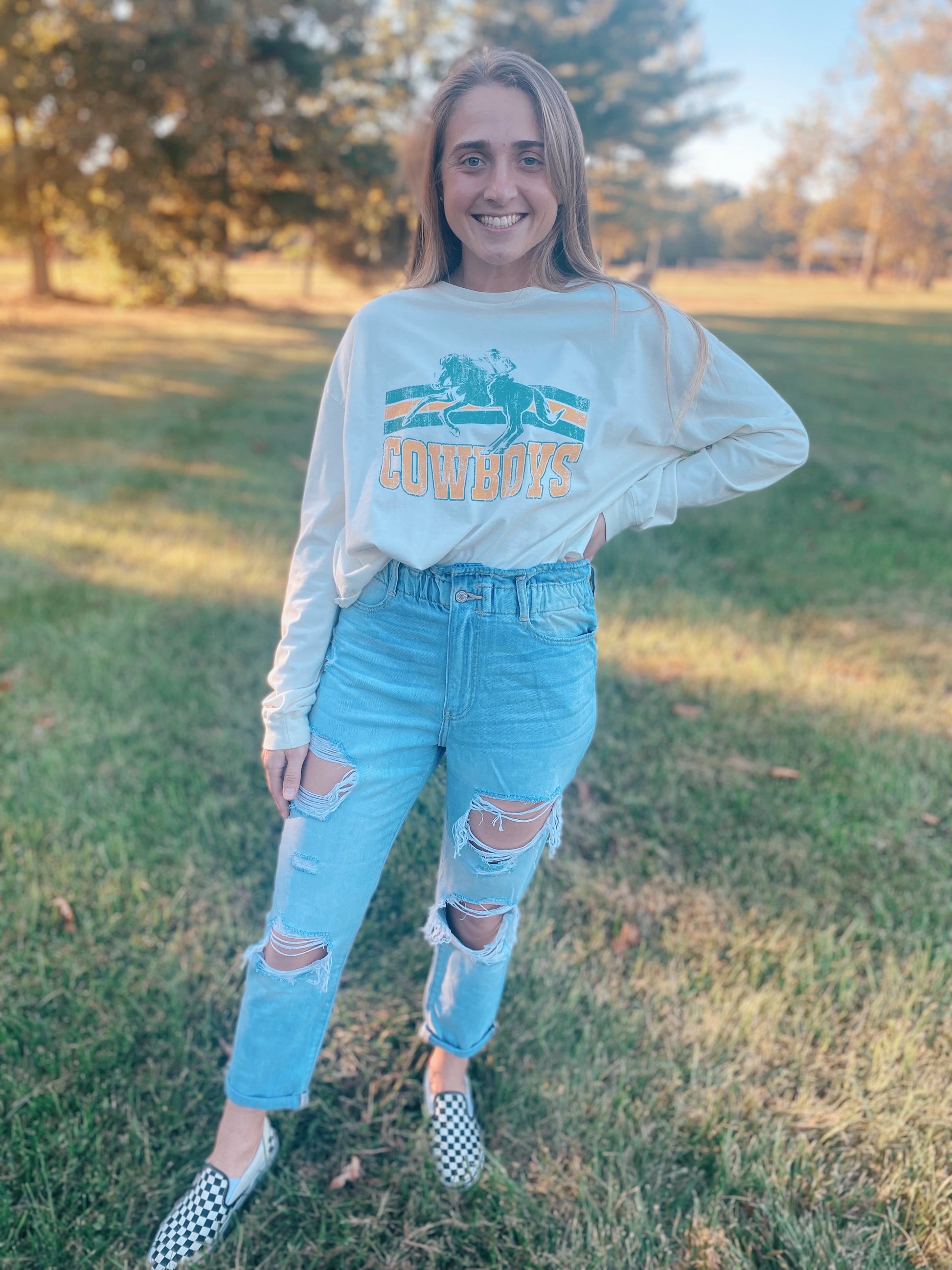 The Kinsley Paperbag Jeans are the cutest lightwash, Kancan, mom jeans. Pair these with your cutest top for the best look!